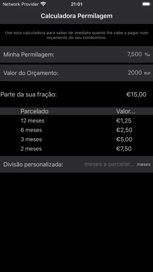 - Não há problema, a aplicação disponibiliza um campo para que possa dividir o valor que lhe cabe pelo número de meses que lhe der mais jeito.