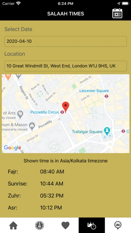 Note: This feature has been added to be used when travelling and should not replace local prayer times as these times may slightly differ.
