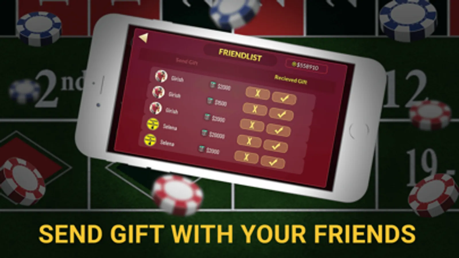 -- Invite and connect with your Friends on roulette tables to get a real social experience along with bonus chips