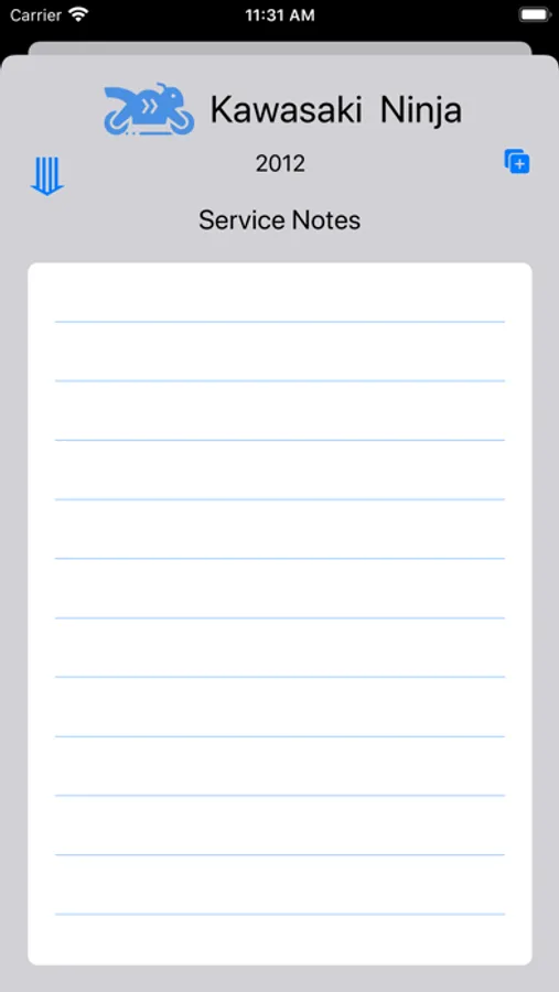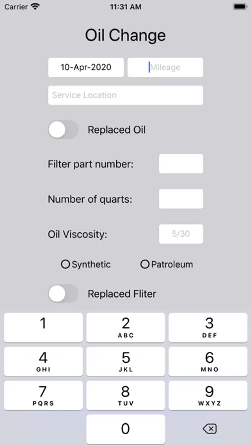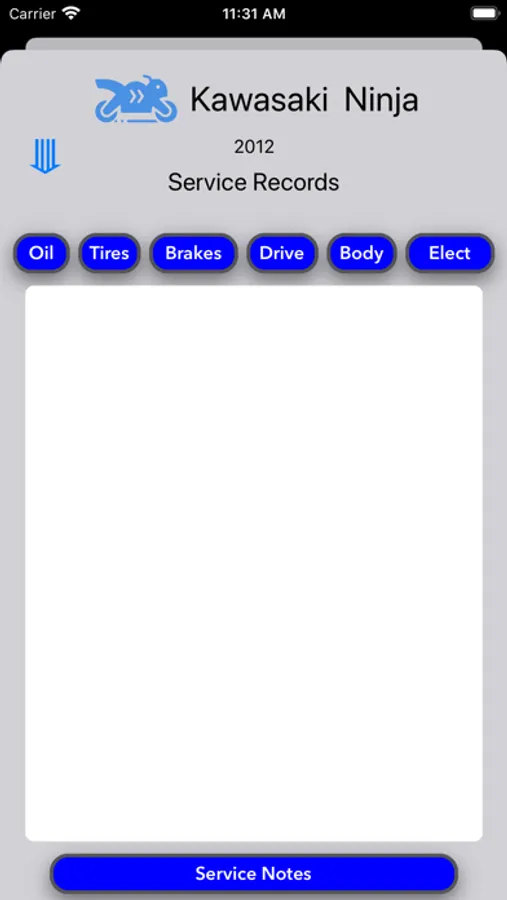 Tap on the vehicle record row in the main home screen, which takes you to the “Service Records” screen, and choose the service component by tapping on one of the blue buttons for the service record you want to record. Service Records are listed by date, the newest at the top—swipe left on a record to delete the record from the database.