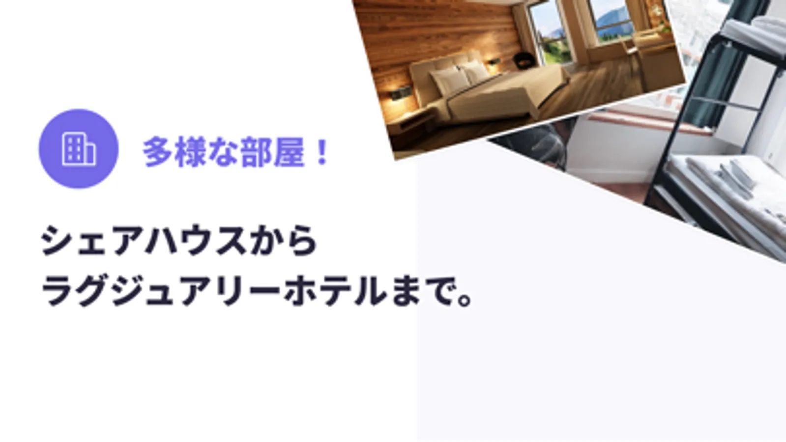 月4万円のシェアハウスからラグジュアリーホテルまで毎月の状況に応じて住まいを選べます。