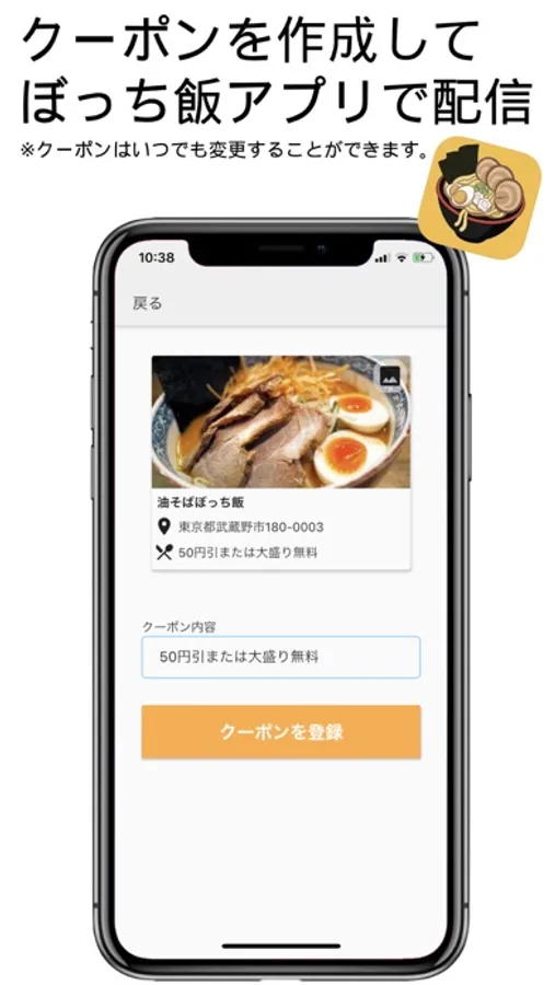 ぼっち飯加盟店舗がクーポンを発行するために利用するアプリです。このアプリを利用して自分のお店をたくさんの人に認知してもらい無事にぼっちを回避できた人が最高な思いをします。
