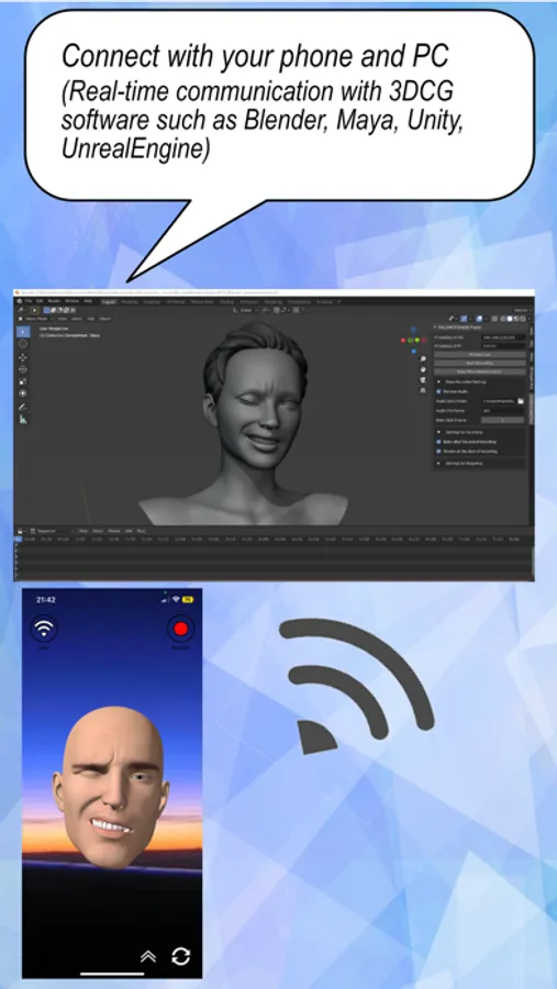 This app can create facial animations by communicating in real time with DAZ Studio, Maya, Unity ,UnrealEngine and Blender. In addition, you can bake recorded animations within the iOS app via streaming.
