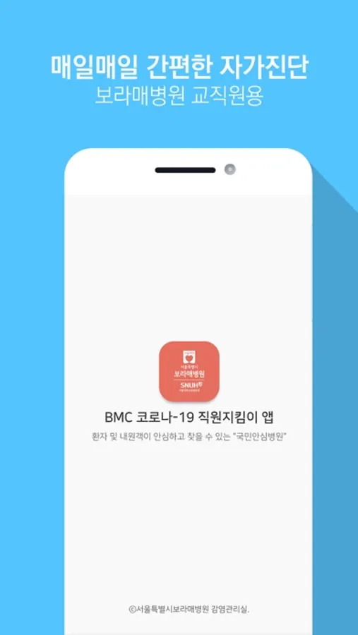 서울특별시 보라매병원 교직원들을 위한 코로나-19 증상 체크 및 즉각적인 감염관리실 보고가 가능한 앱입니다.