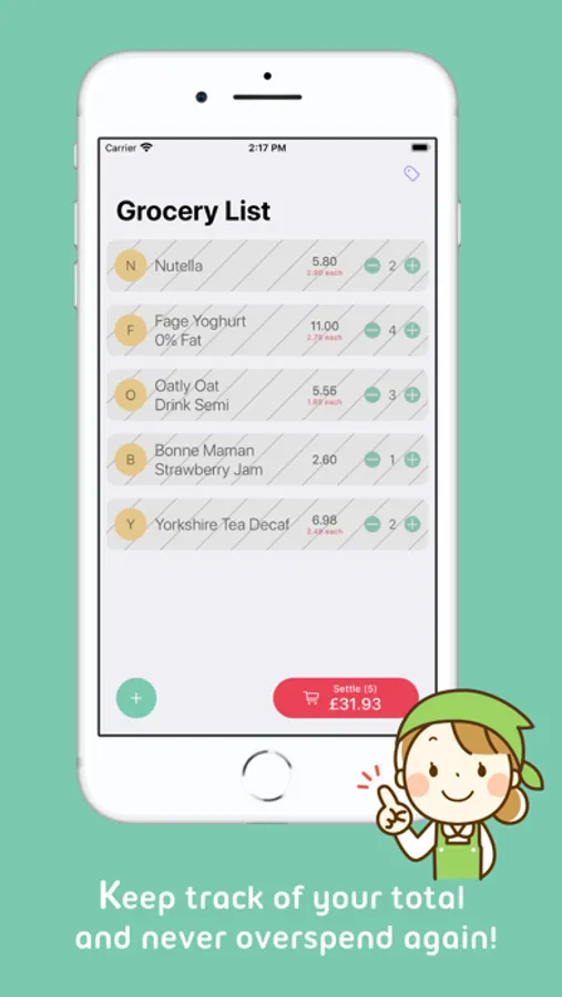 Using your Mindy Grocery List app, you can track how much your running total is while shopping, and then decide later to cut down on some items if you are over budget. It's not just a checklist, but a mindful assistant!