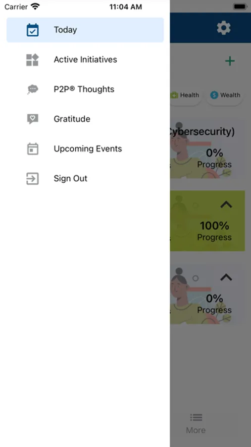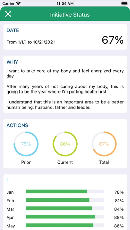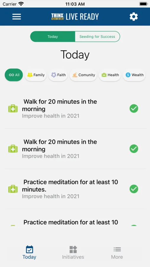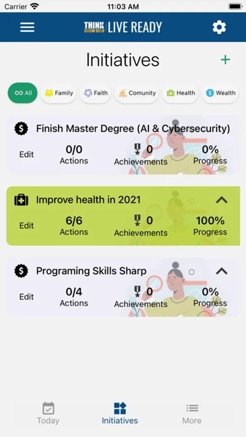 In the Purpose Goalcard, the user will be able to see the completion percentage in each of the predefined areas: Family, Faith, Community, Health and Wealth.