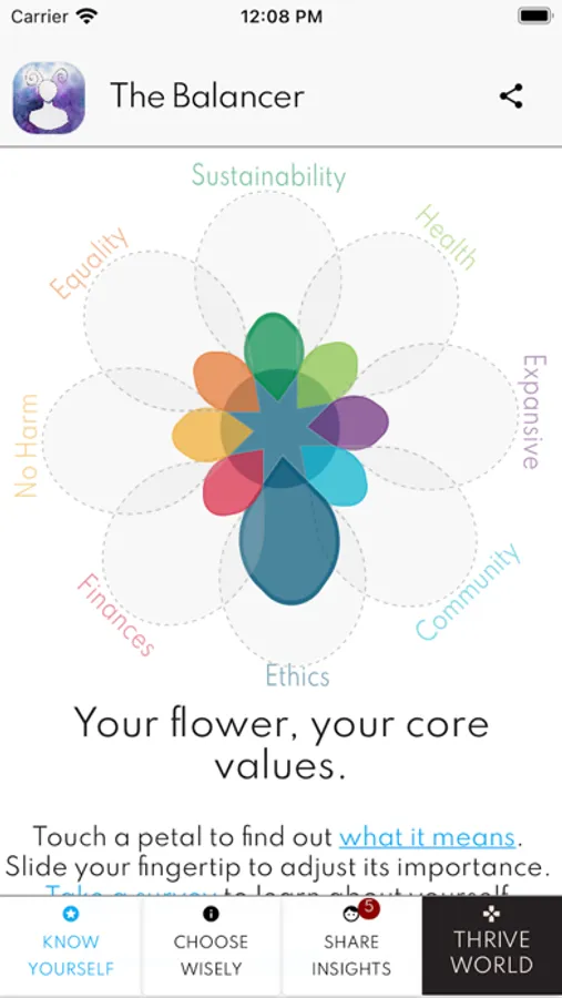 1/ You will discover your core values, and learn to know yourself better in the process using our Balancer Flower and questionnaires. We also offer the opportunity to develop yourself while learning to make those positive impacts you care about.
