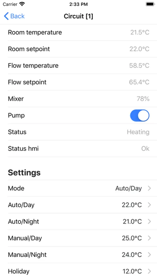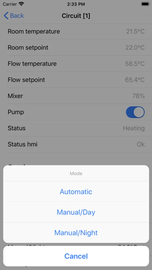 - Change heating circuit mode (Day/Night or Automatic/Manual)