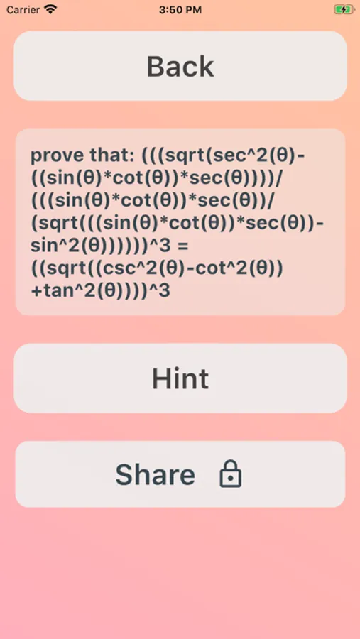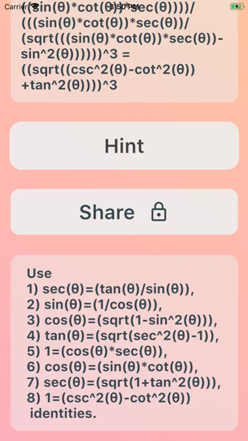 It has four difficulty levels ie 'Easy', 'Medium', 'Hard' and 'Tricky'. To use the application one would tap on Generate button. Then he/she has to choose difficulty and finally he/she will get question. If while proving questions, one gets stuck then he/she can access hint for that question and can then solve the question easily. The hint section normally remains hidden so that while solving question one cannot see it and when required can see by tapping on the hint button present below the question. It can generate millions of different questions.This application can help you to not consider trigonometry prove that as your weak point but as your power point in your exams.