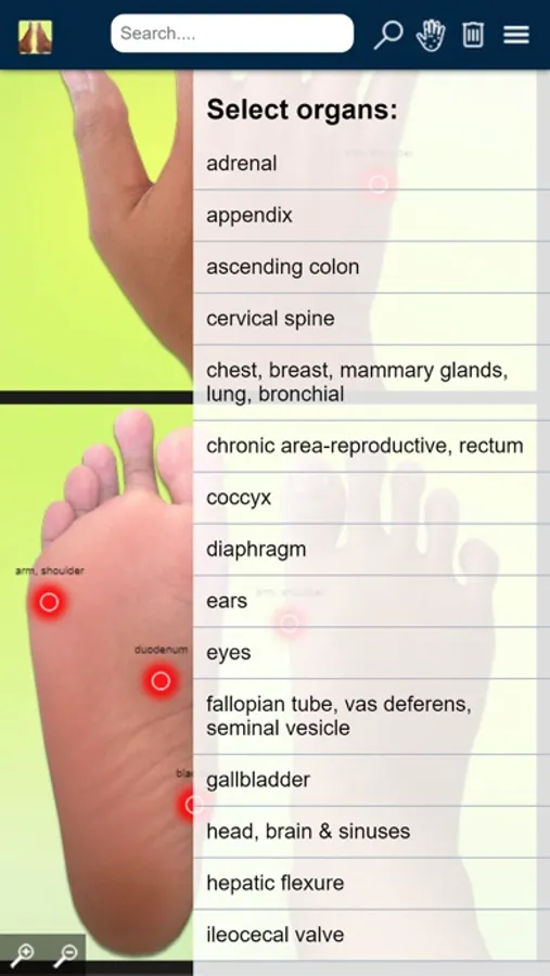 With this app you can search for any organ of your body and find the related reflexology areas/points in you feet or hands easily.
