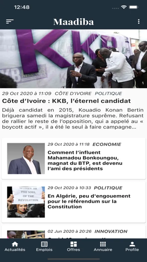 Maadiba est une application qui permet de suivre l’actualité nationale et internationale. Maadiba offre aussi la possibilité de consulter les différentes offres d’emploi, ainsi que les modèles de réussite qui ont fasciné le monde à travers leurs inventions ou parcours professionnels.