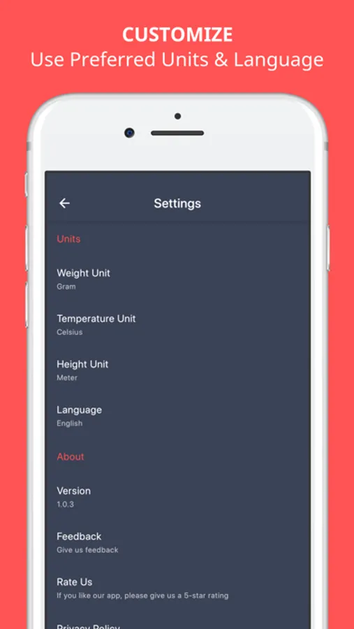You can not only enter the information in grams, Celsius, & meters, but also ounces, Fahrenheit and feet.