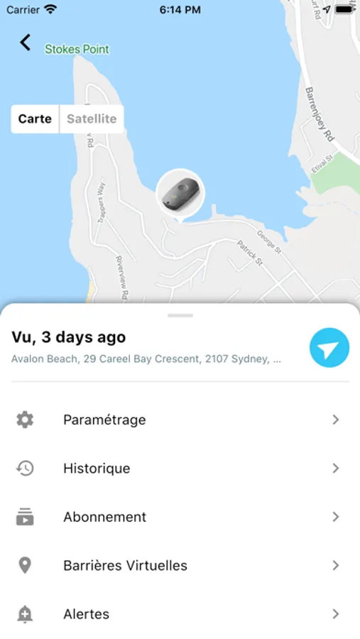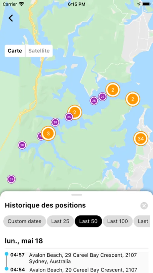 Historique des positions : itinéraire géolocalisé et daté sur la carte de l’application.