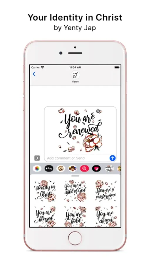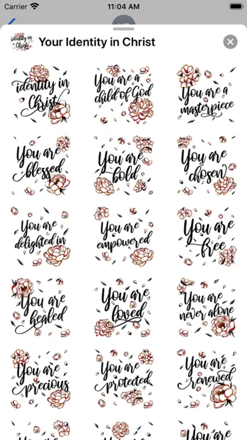 Identity in Christ is a collection of iMessage stickers that remind us of Gods gifts to us. This collection was purposely designed so you can easily use it to send to your friends, family and anyone that you think needs a daily reminder of who they are.