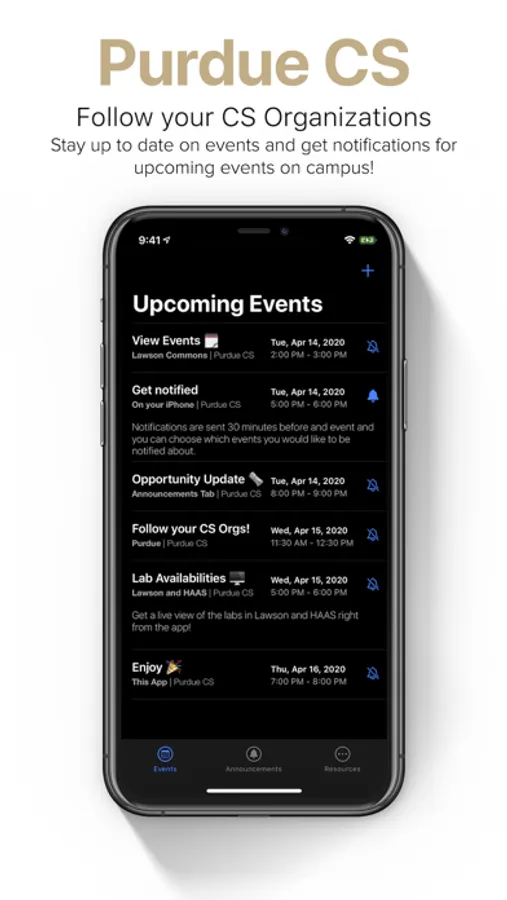 Add the CS organizations at Purdue you want to be involved with and follow their upcoming events. Choose to get event notifications 30 minutes before they begin to make sure you don't miss out on any events by student organizations.