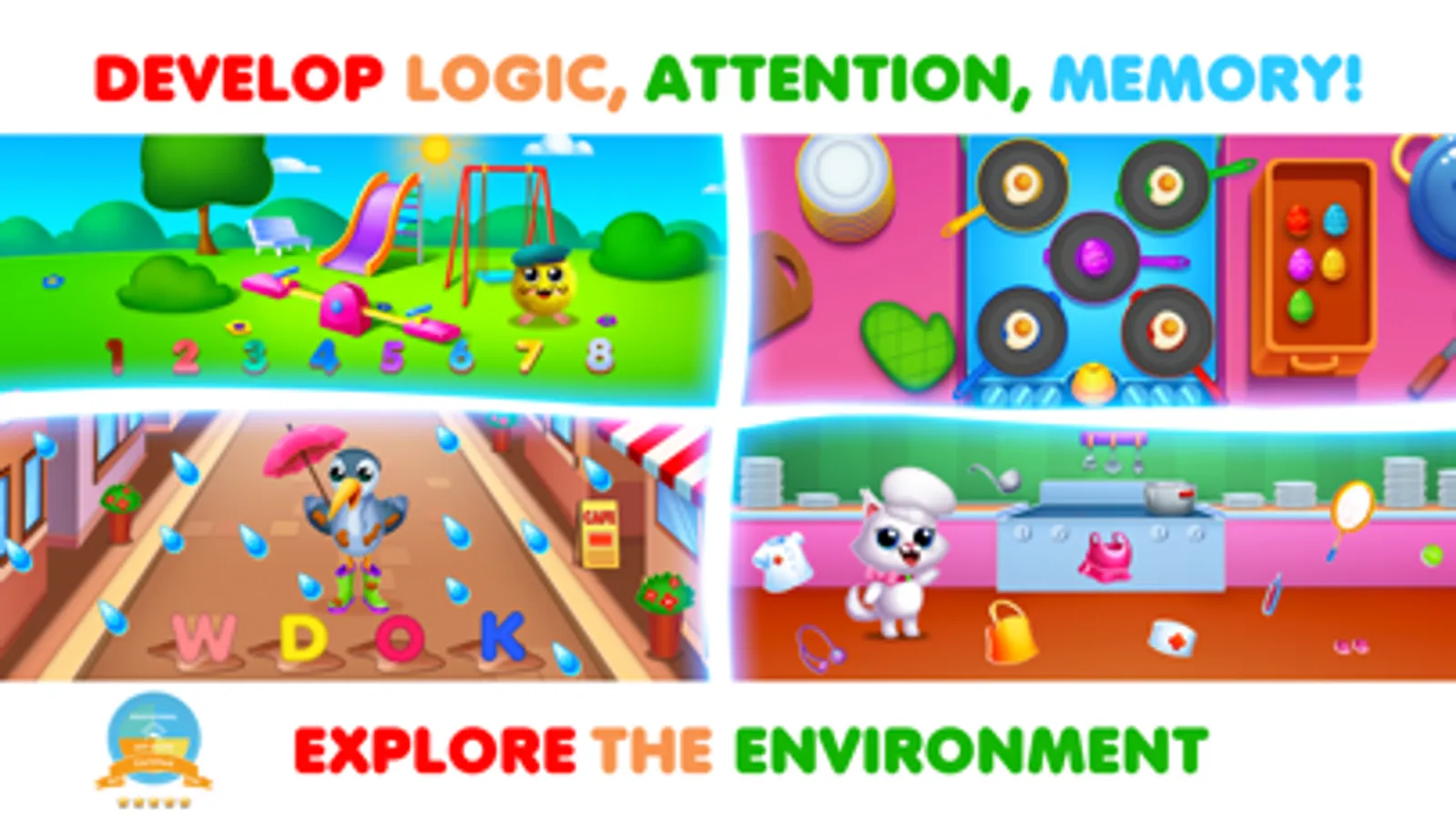 Fun characters will entertain your child with different sound effects, funny animations, and help easily navigate the game.
