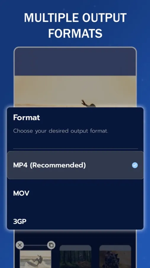 - MP4, MKV, AVI, 3GP, FLV, MTS, MPEG, MPG, M4V, MOV, VOB formats are supported as input for merging videos.