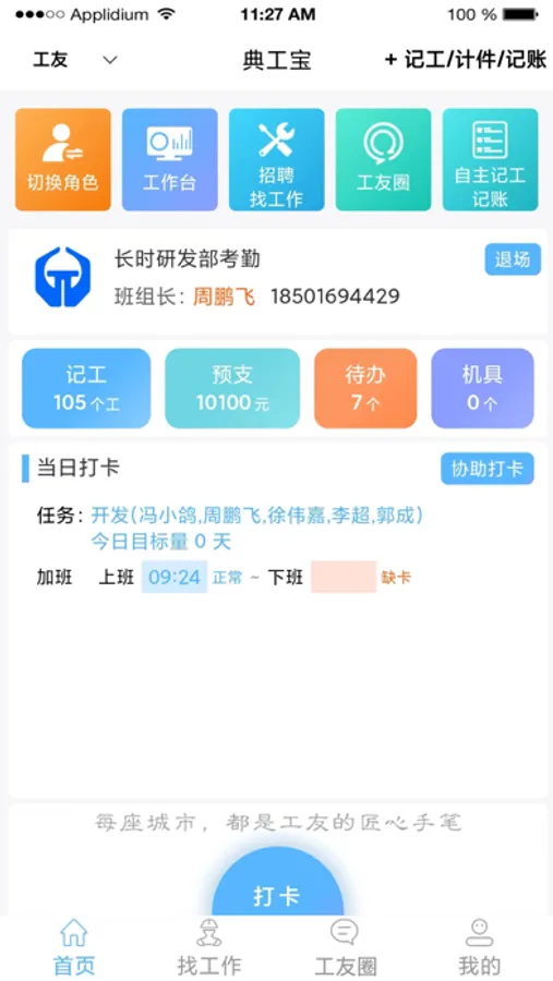 劳务施工类型项目管理App,集考勤打卡、在线派活、下班报量、工钱结算/发放于一体的易用工具、帮助班组提升效率、降低成本,同时也是班组长和劳务公司不可缺少的工具利器。