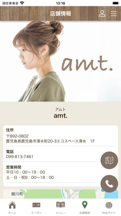 店舗のマップが表示され、地図アプリとも連携しているので、初めてのご来店の時も簡単に見つけることができます。