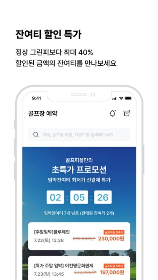 이제, 골프피플에서 임박 잔여티를 최대 40%까지 할인 된 금액으로 다녀오세요~