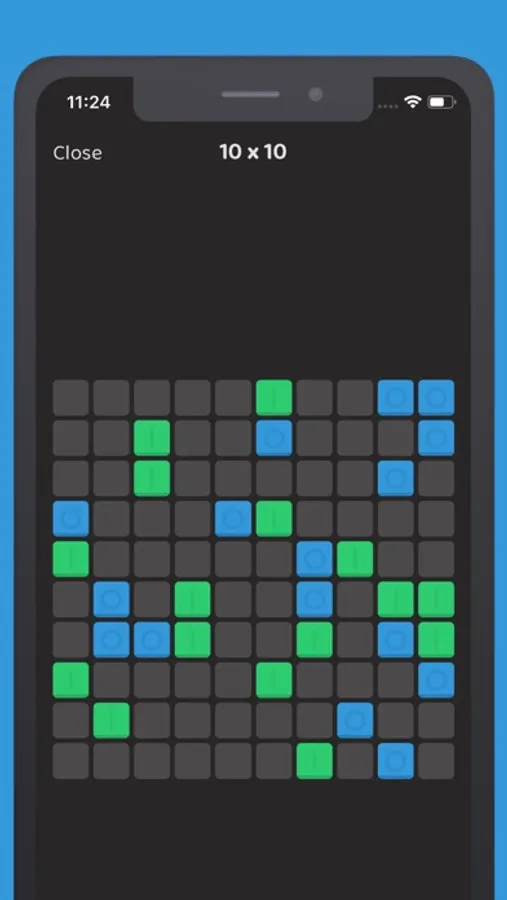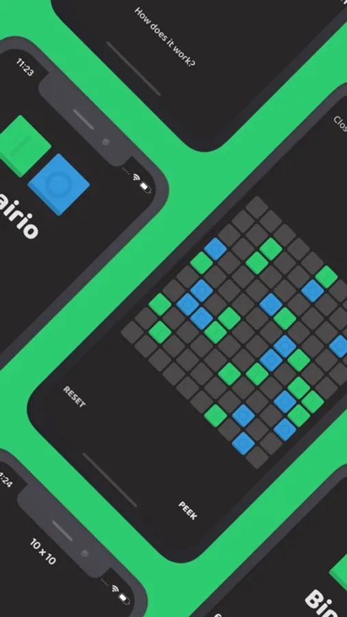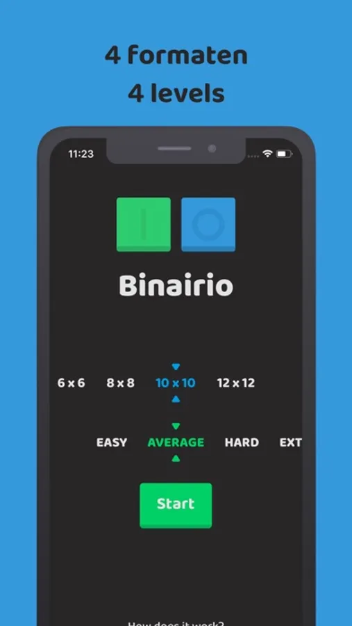 The goal of a binary puzzle is to have the same number of zeros (blue) and ones (green) in every row, and in every column. Each game starts with a grid with a few boxes already filled in. This must be completed further with the following lines: