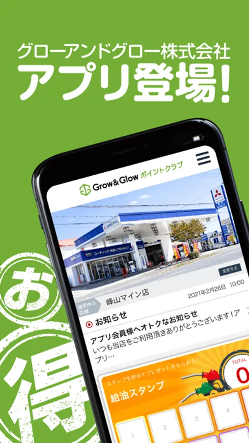 当社のアプリ「Grow&Glowポイントクラブ」は給油やカーメンテナンスをするたびにスタンプが貯まり、決められたスタンプ数を貯めるとお得なプレゼントクーポンと引き換えができる、貯めて楽しいもらえて嬉しいお得なアプリです。また、ご登録いただいた店舗で利用いただけるお得なクーポンや各種メニューの割引情報を配信しておりますのでぜひご活用ください。