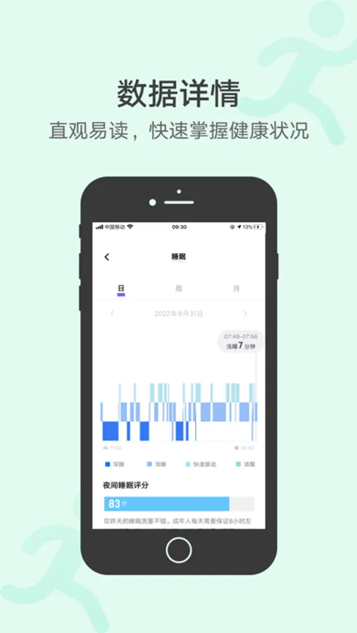 3)记录每天的睡眠情况,深睡、浅睡、快速眼动、清醒时间,并为您的睡眠状态评分。