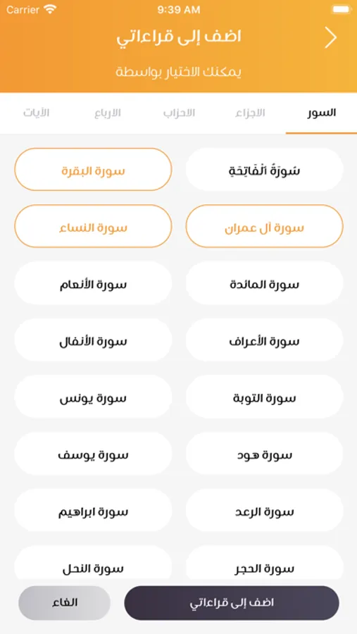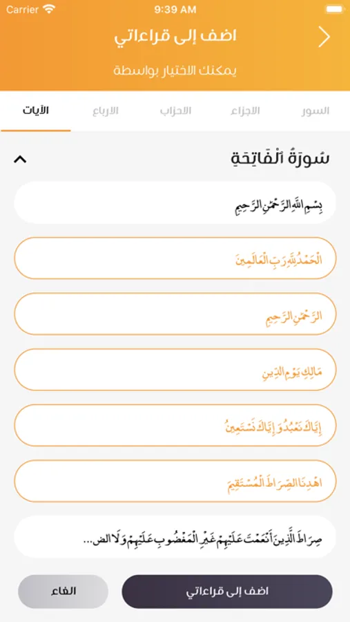 - اختيار سورة او جزء او حزب او ربع او آية للمراجعه.