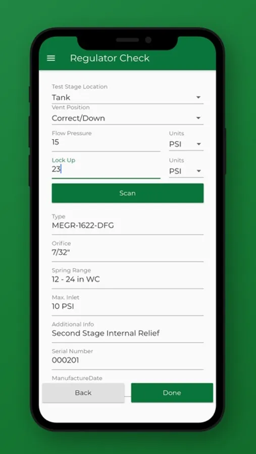 No longer need to keep track of stickers or write down regulator information when using the included Scan function built into the application. Using the camera on the phone and MEC™ domestic regulators, the barcode may be scanned to populate the regulator information. If a regulator does not have a barcode, the information may be added to the regulator check section.