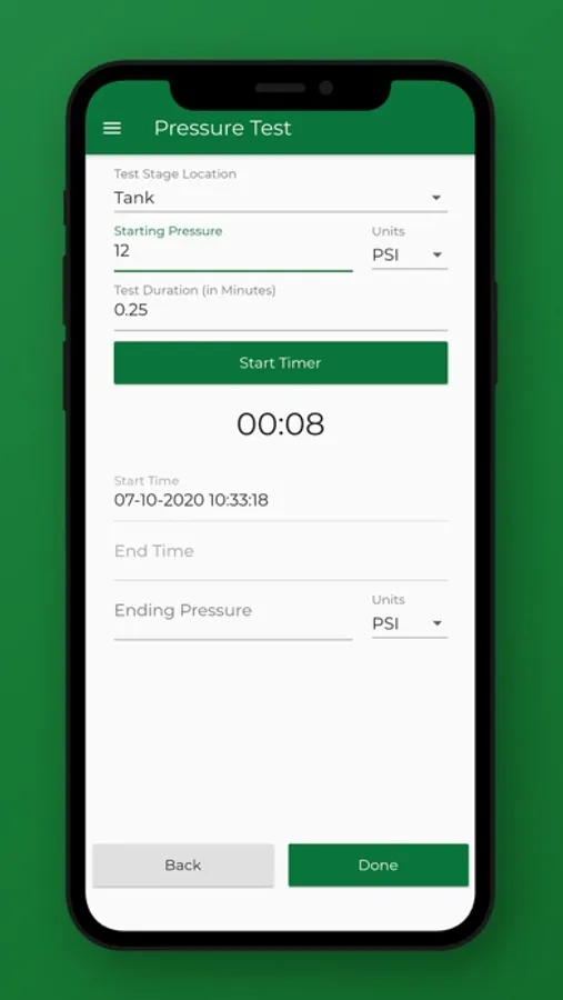 Starting the pressure test automatically documents the time stamp for the start of the test. At the end of the test, it will automatically add the time stamp for the end of the test.