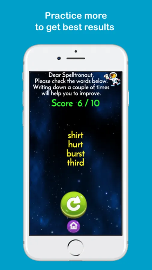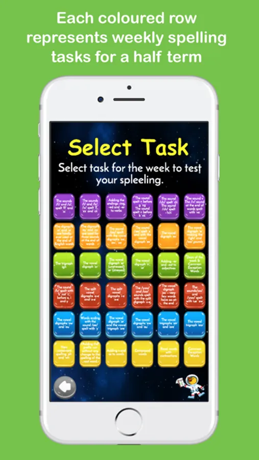 Kids learning focuses on appropriate study for different year groups so in Spelltronaut : Primary Spelling game, words are grouped in primary school year groups. The programme follows weekly spelling lists grouped in coloured rows for each term. The only thing kids need to do is to choose weekly spelling same as school learning and study at home freely and whenever they choose. After selecting weekly spelling kids will see the list of words and have time to study and learn the words before starting their weekly spelling test. Enabling tips will show an example sentence to help spelling if you are learning homophones or near homophones. It is possible to listen to the English words again if you struggle to hear them at first. Type words and click check to see if the English words are correct. If misspelt kids will see the correct spelling. At the end of the spelling test, kids will be able to see their score, their mistakes and learn from them. Study more to achieve better scores.