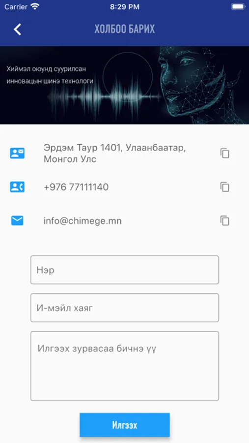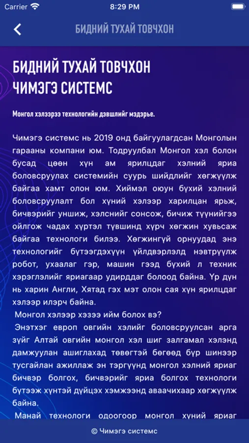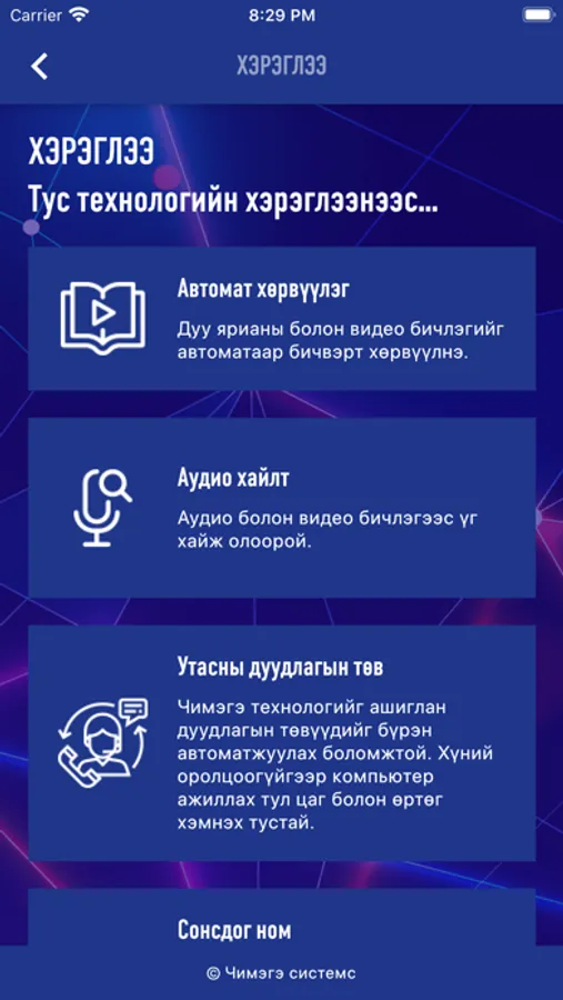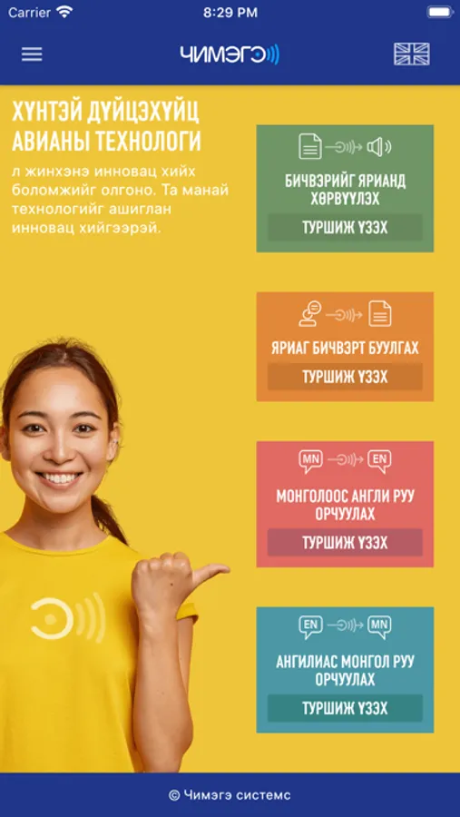 This application is a demonstration of the first-ever Mongolian voice processing technology. Chimege technology further enables Chimege Writer to invert voice to text, Chimege Reader to invert text to voice, voice translation systems between Mongolian and other languages, Mongolian robots and other systems which simplify human-computer interactions, etc. Our research team reached a four percent error rate in our speech recognition system which is a human-level accuracy. As such, in terms of Mongolian language processing, we have established a milestone for the new age of the digital industry.