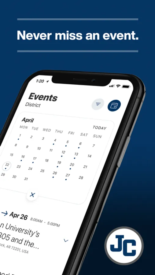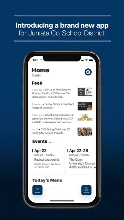 The event section shows a list of events throughout the district. Users can add an event to your calendar to share the event with friends and family with one tap.
