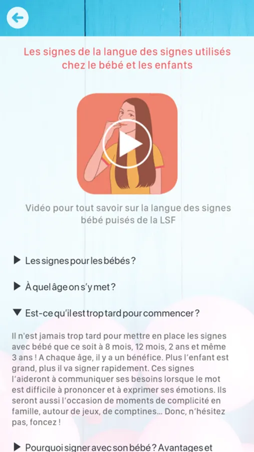 • Les signes de l’application sont de véritables signes de la Langue des Signes Française s’adressant ainsi autant aux parents et professionnels de la petite enfance qu'aux passionnés de la LSF désirant réviser et apprendre de nouveaux mots.
