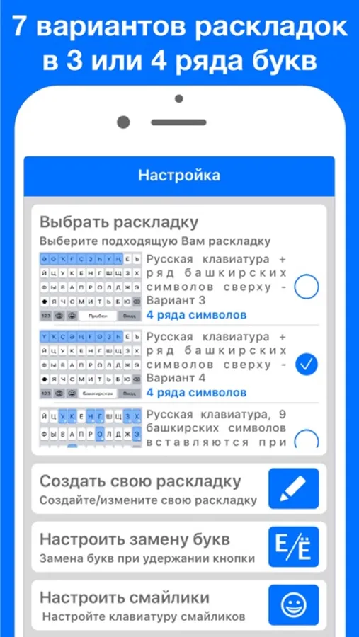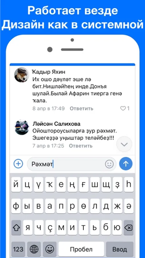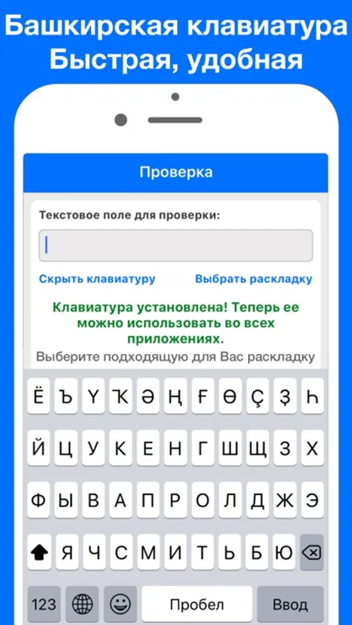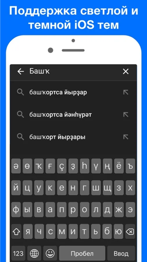 Быстрая и удобная Башкирская клавиатура с разными вариантами раскладок. Работает во всех приложениях и выглядит как системная клавиатура iOS.