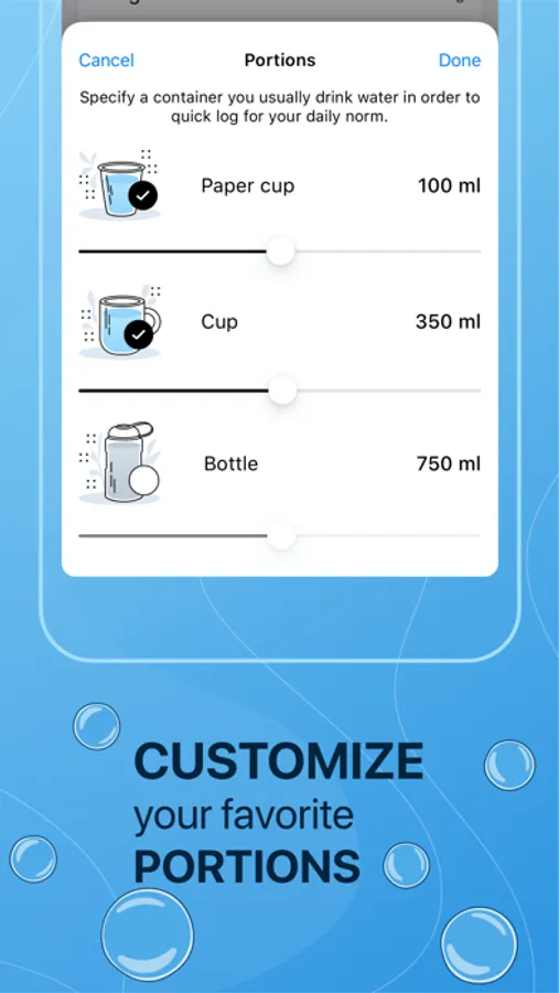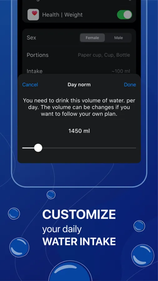 One of the critical factors of good health is the proper water balance in the body. uWater helps to control the hydration level to feel healthy and active. The application calculates the daily water rate based on several physical parameters, sleep cycles, and training programs. Also, it serves as a water reminder and pings when you should drink water to maintain body fluid balance.