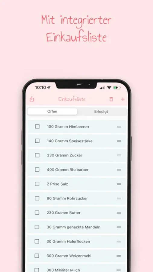 [6] Mit nur einem Klick landen alle Zutaten auf deiner persönlichen Einkaufsliste. So kannst du sie beim Einkauf schnell abhaken. Und damit du nicht mehrere Einkaufszettel-Apps benötigst, kannst du deine die Liste durch eigene Produkte ergänzen.