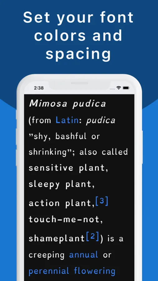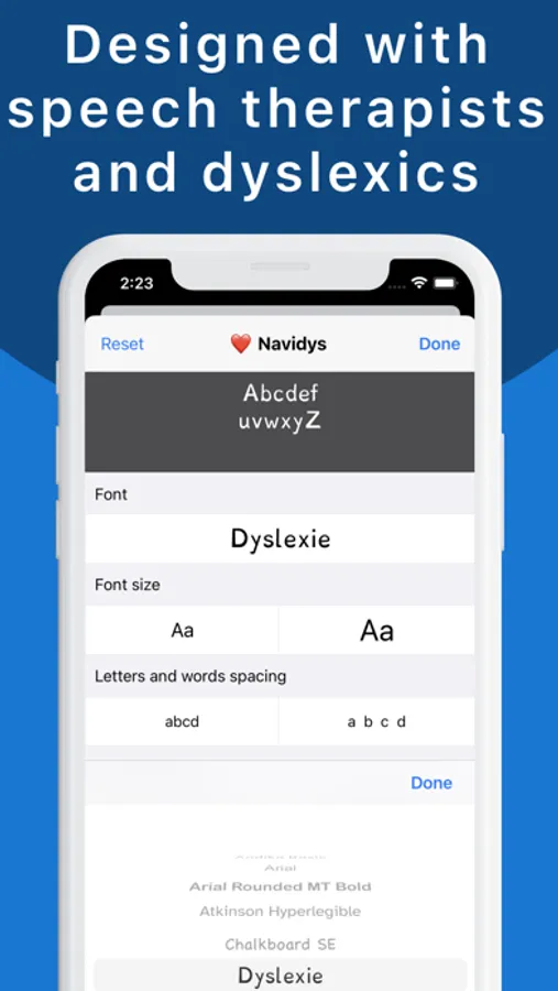 - Changing the font (Helvetica, Dyslexie, Andika Basic, Arial, Arial Rounded MT Bold, Chalkboard SE, Gill Sans, HelveticaNeue-Light, Kailasa, Optima, Trebuchet MS, Verdana, Sylexiad, Luciole, Eido Mono, AccessibleDfA)