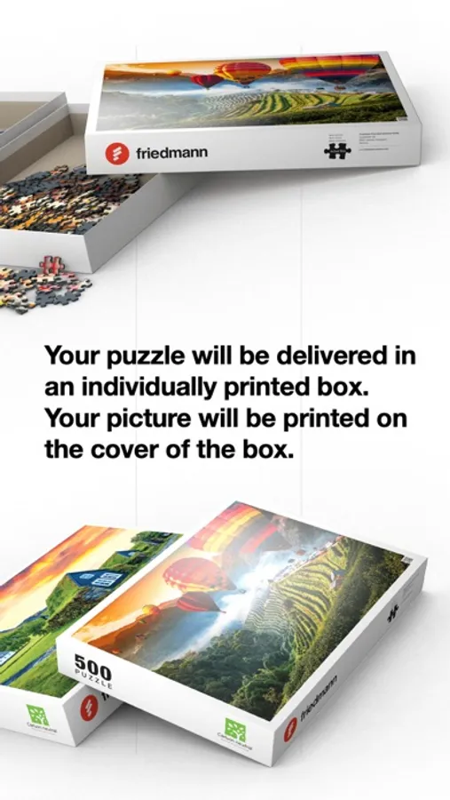 You would like to order an individual premium puzzle with a photo of your choice? With our “Print your Puzzle” app this is perfectly easy: select your photo, put it in the right position and click order. We produce 1000- and 500-piece puzzles. For manufacturing our puzzles, we use carbon neutral energy. As a preview, your puzzle will be shown to you in 3D. Even an augmented reality preview is available. Your photo puzzle will be printed on linen-embossed paper which is laminated onto a blue premium puzzle cardboard with a thickness of 1.9 mm. The puzzle will be delivered to you in a rigid box with your picture as the cover. Friedmann Print is a subsidiary of the LUDO FACT group. The group of companies employs around 750 people at eight locations worldwide. In our group, we produce more than 17 million board games and puzzles a year.