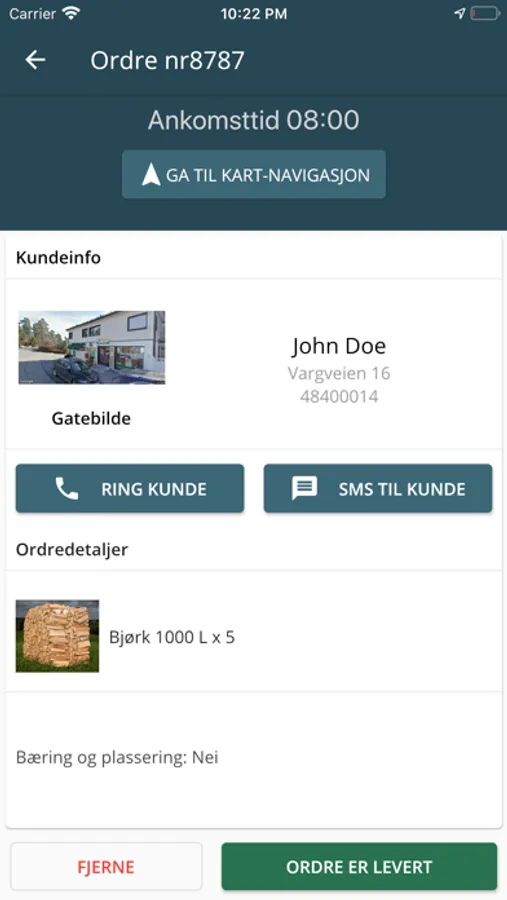 Appen viser ordre- og kundedetaljer.