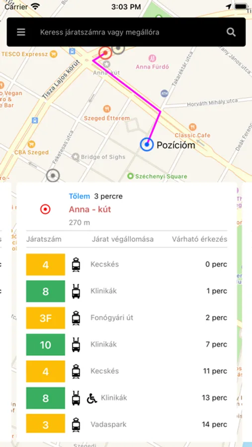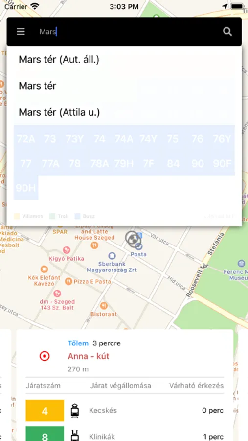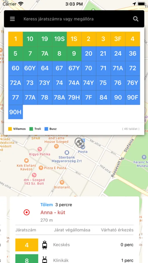 Szegeden jelenleg megállóhelyi kijelzők csak néhány megállóban vannak kihelyezve. Az online utastájékoztatást megvalósító mobil applikáció a megállóhelyi kijelzők adatait jeleníti meg bármelyik megállóra függetlenül attól, hogy az adott megállóban van kijelző vagy nincs. Az alkalmazás a felhasználóhoz legközelebbi megállók adatait jeleníti meg. Minden megálló esetében a kijelzőkhöz hasonlóan kiírásra kerülnek a következő érkező járatokat, azok végállomása, a várható érkezési idők perc pontossággal és az, hogy a várható érkezési idő a menetrendi adatokból származik vagy a jármű pontos pozíciójából lett meghatározva. Az alkalmazás megmutatja térképen a megálló helyét, a távolságát és az odavezető legrövidebb utat. Ezenkívül még kijelzi a városi közösségi közlekedési cégek diszpécseri és egyéb kereskedelmi, utastájékoztatási figyelmeztetéseit és üzeneteit.