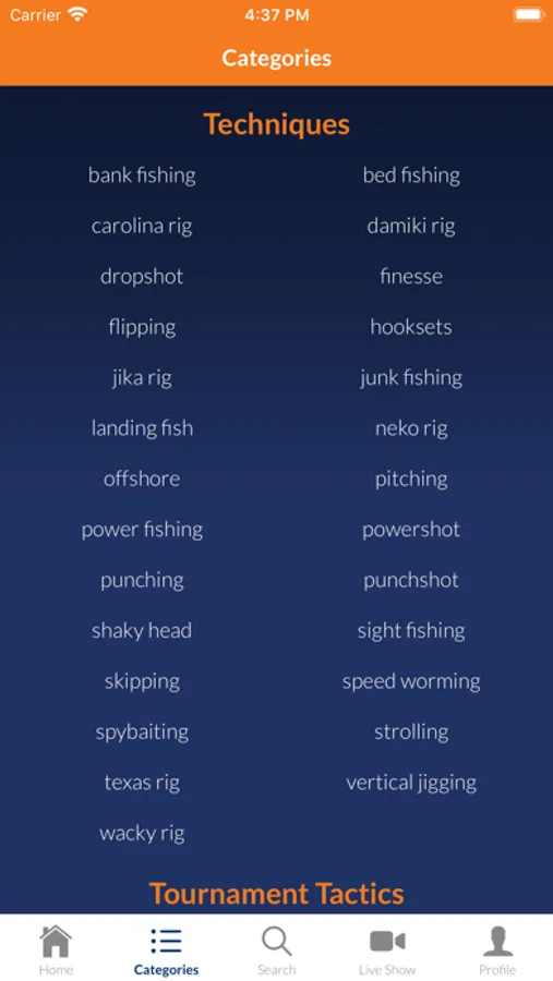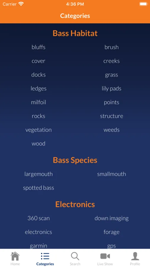 - Categories: the highly detailed search tool to help you find exactly what you want to learn based around lures, techniques, bass habitat, electronics, seasonal info and conditions
