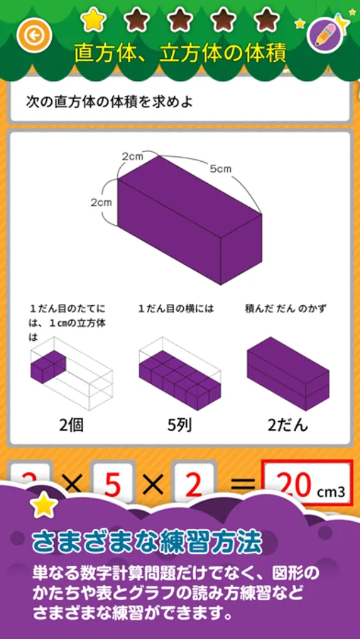 繰り返し練習をすることで自然と算数の考え方が身につくようになっていますので、はじめから順番に学習したい人にも、苦手な部分を集中的に学習したい人にもおすすめです。