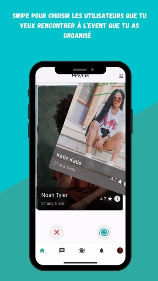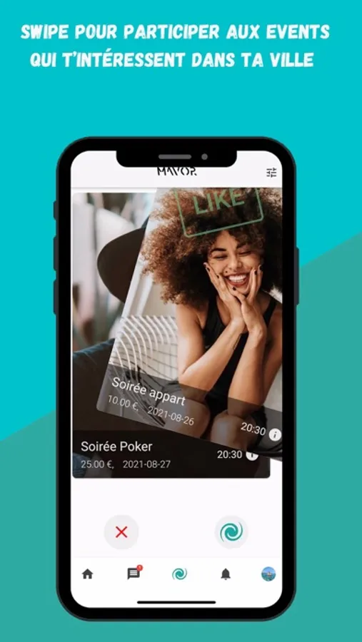 Participe aux events organisés autour de toi par les utilisateurs de Mavor, tu as le choix en les swipant, à droite si tu veux bien participer à l’event organisé ou swipe gauche si tu n'es pas intéressé. Tu as le choix si tu veux aller à une soirée appart, un match de foot, soirée makeup ou encore soirée Poker il y en a pour tous les goûts !
