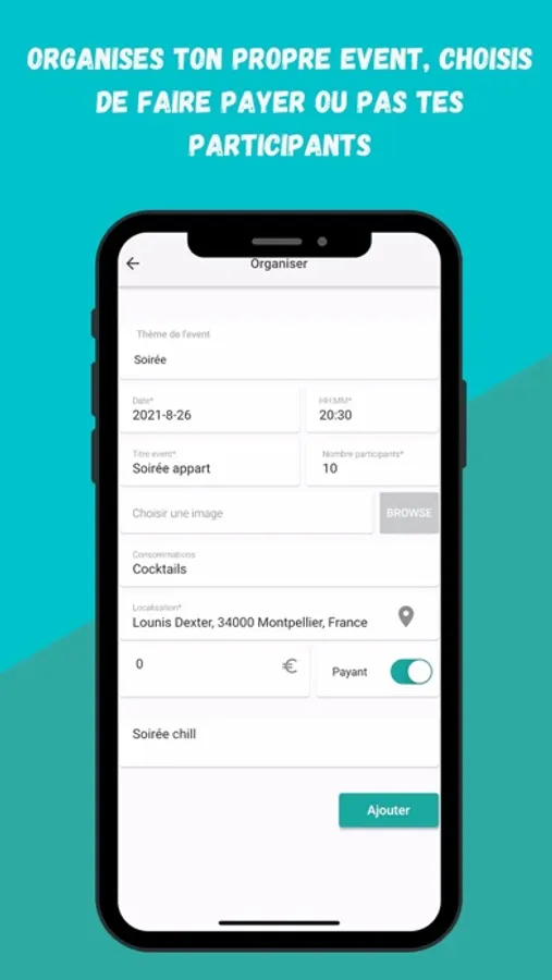 Là tu prends les choses en main, tu organises ton event (apéro, gaming, soirée, match de foot , basket...) , tu entres toutes les infos pour ton event : l'heure, la date, le lieu, le nombre de participants que tu veux, ton adresse si tu veux faire une soirée chez toi. Tu peux choisir ou pas de faire payer ton event, il n'a jamais été aussi fun et facile de gagner de l'argent et arrondir ses fins de mois ! Quand tu as rentrés tout ça, tu vas pouvoir swiper toute les personnes qui sont prêtes à sortir autour de toi ! Donc swipe droit si un profil ou un groupe de pote qui veulent sortir ensemble t’intéresse et swipe gauche si tu n'es pas intéressé. Personne n'en saura rien de ton choix sauf si il y a swipe droit réciproque entre l’organisateur et le participant.