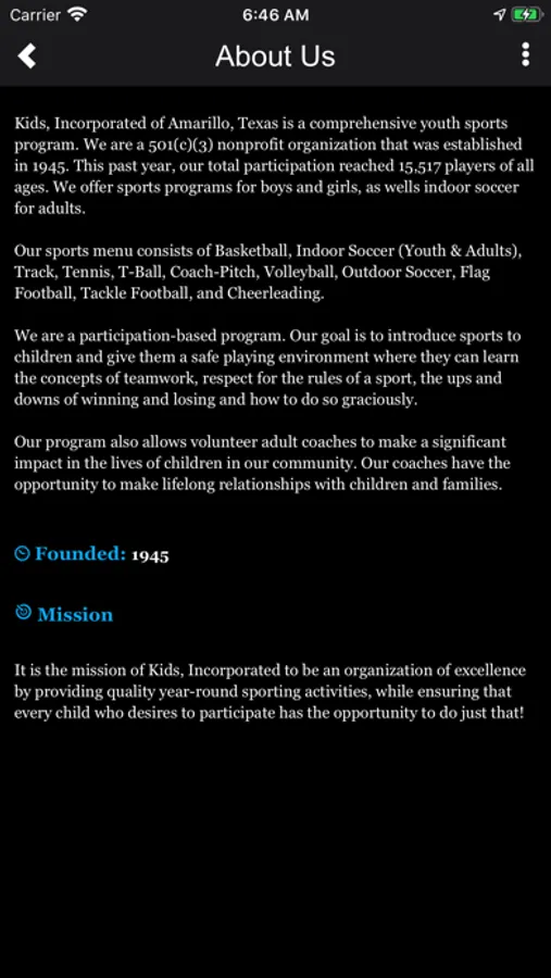 Established in 1945, Kids, Incorporated of Amarillo, Texas is a comprehensive youth sports program for boys and girls ages 4 and up. Sports offered include: Basketball, Indoor and Outdoor Soccer, Track, Tennis, T-Ball, Coach-Pitch, Volleyball, Flag Football, Tackle Football and Cheerleading.