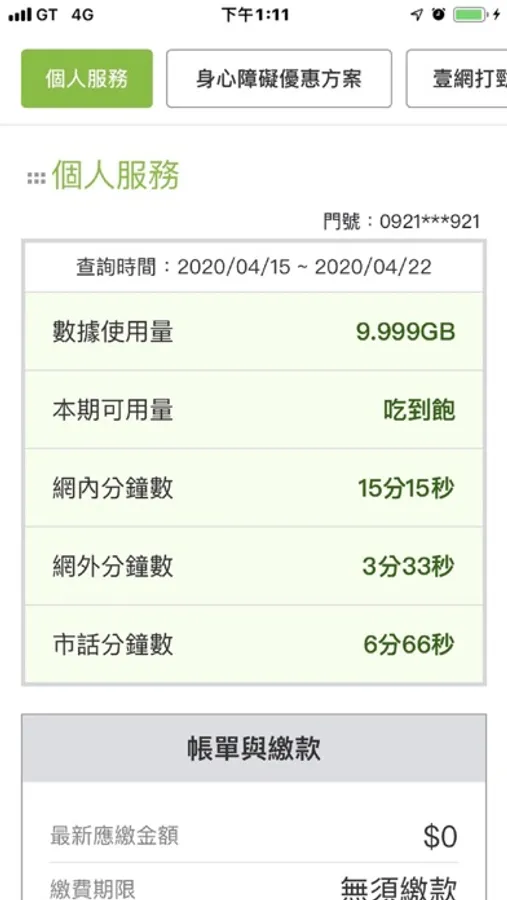 1.用量查詢:數據用量、網內分鐘數、網外分鐘數、市話分鐘數。