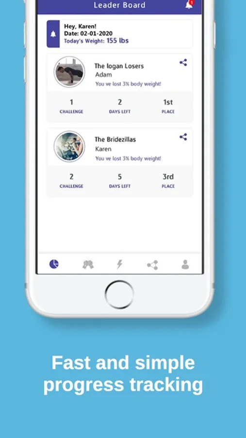 Users can compete in either individually-based challenges or team-based challenges. For team-based challenges, users compete as a team against other team(s) for the highest average percentage of body weight lost!