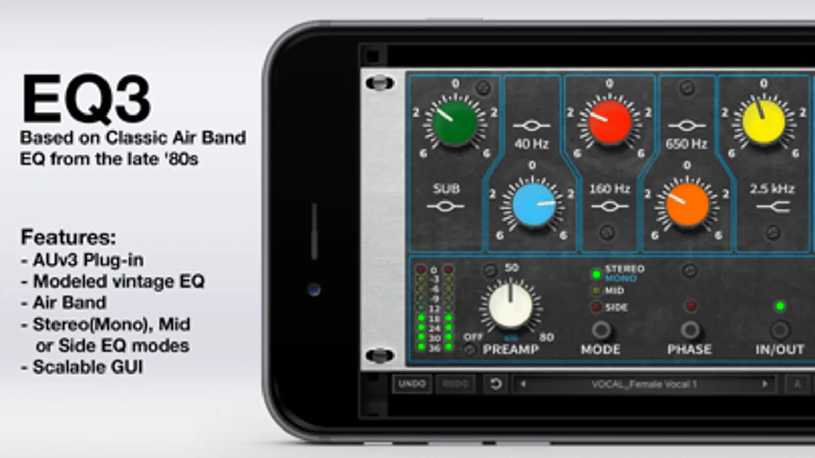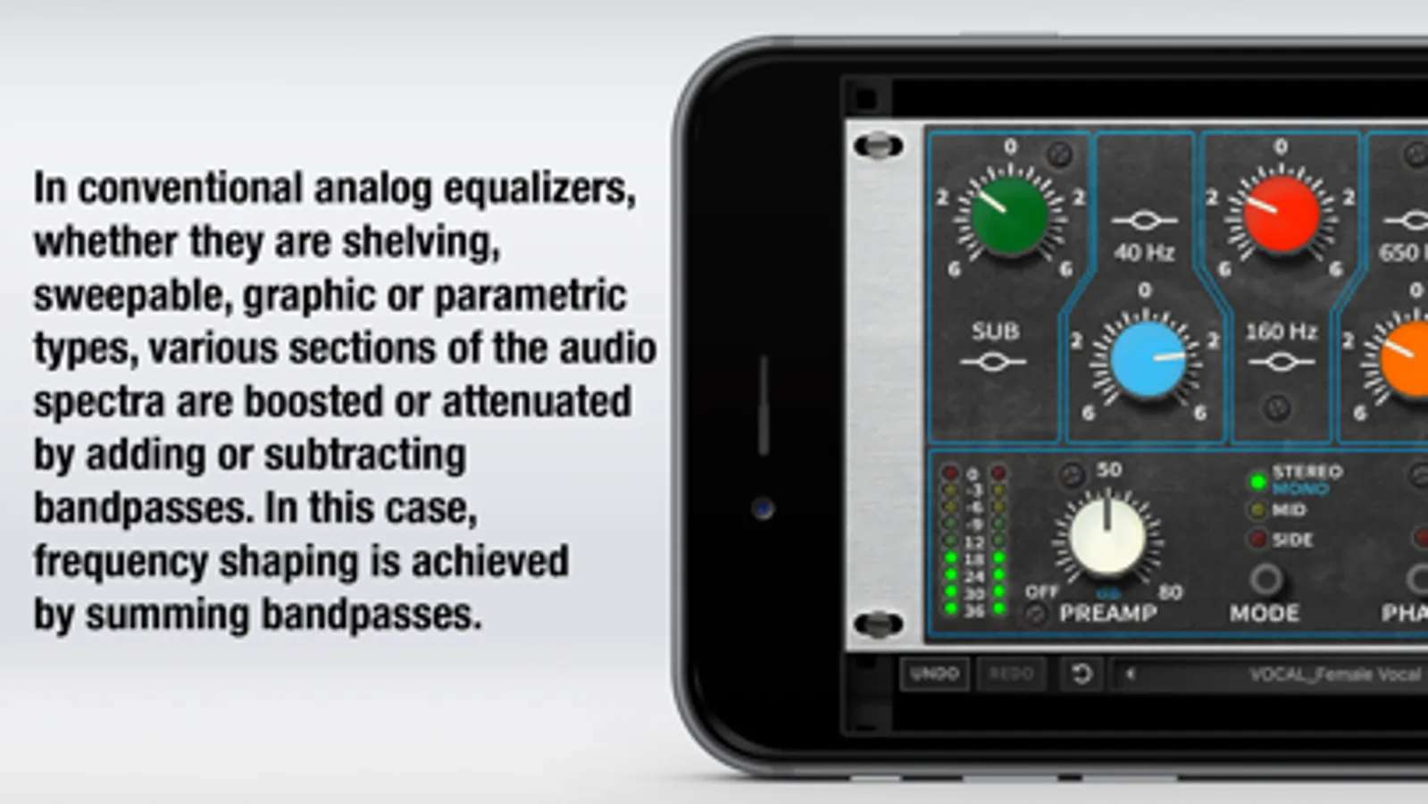 • Stereo (Mono), Mid or Side EQ modes;