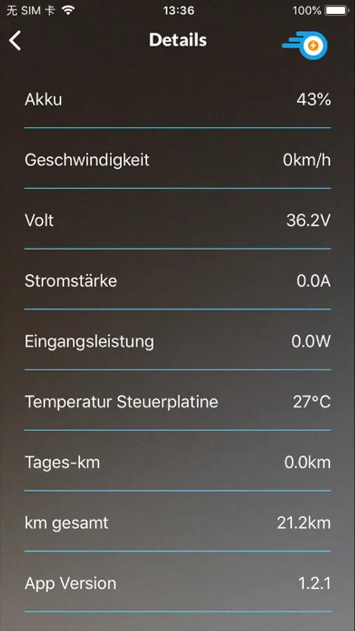 - Anzeige von: Batteriestand in %, Geschwindigkeit, Spannung des Akkus in V, Temperatur der Steuerplatine, Tageskilometer, Gesamtkilometer, Stromstärke aktuell (in Ampere), Eingangsleistung aktuell (in Watt)